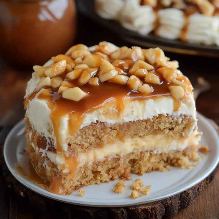 Indulge in the delightful flavors of our Caramel Apple Toffee Cake, a moist poke cake that masterfully combines sweet apples, rich caramel, and crunchy toffee bits. Perfect for any gathering, this dessert is sure to impress with its layered textures and comforting taste. Topped with fluffy whipped cream and drizzled with caramel sauce, each bite offers a satisfying blend of sweetness and indulgence.