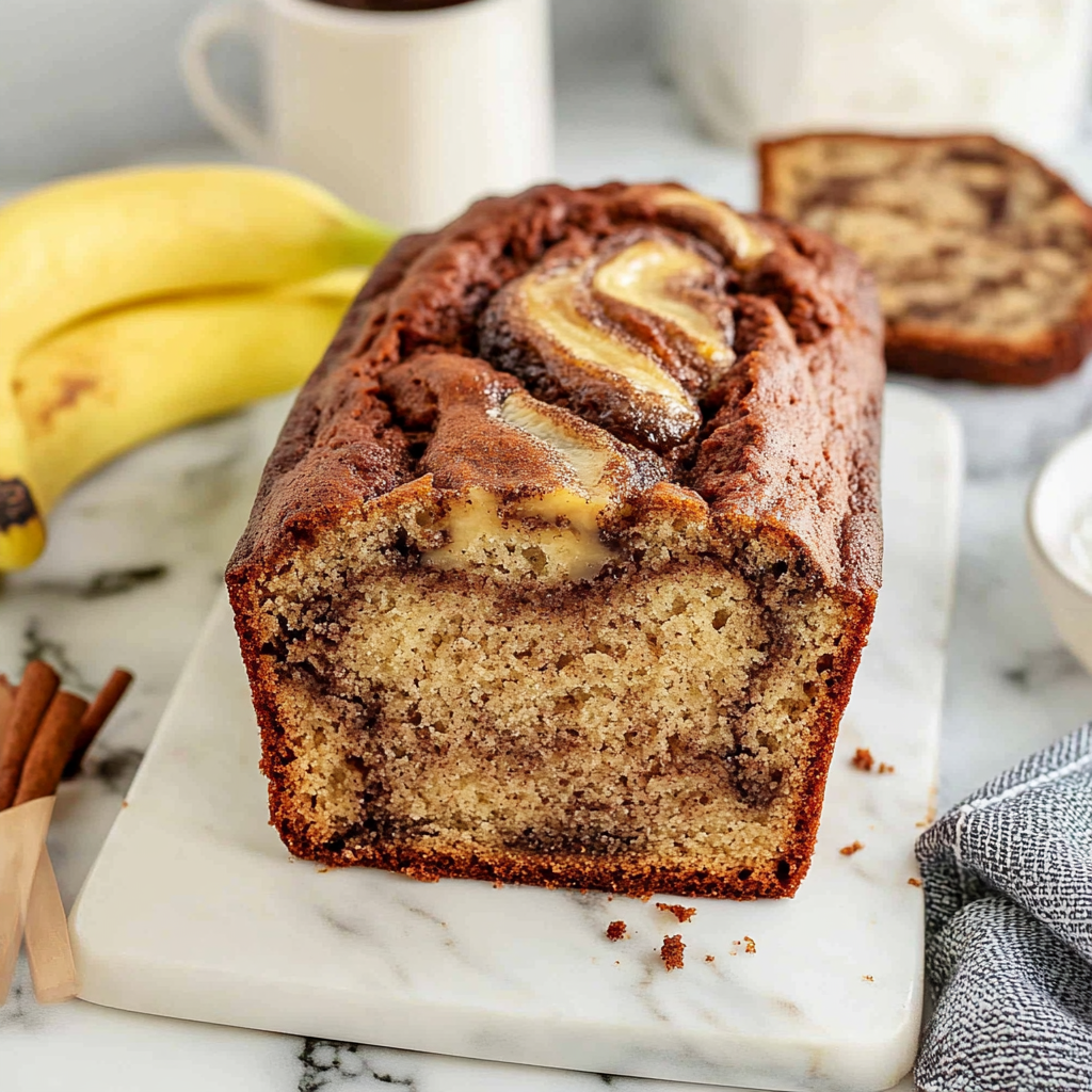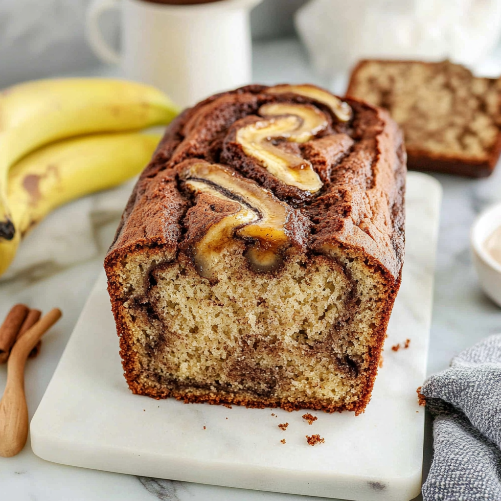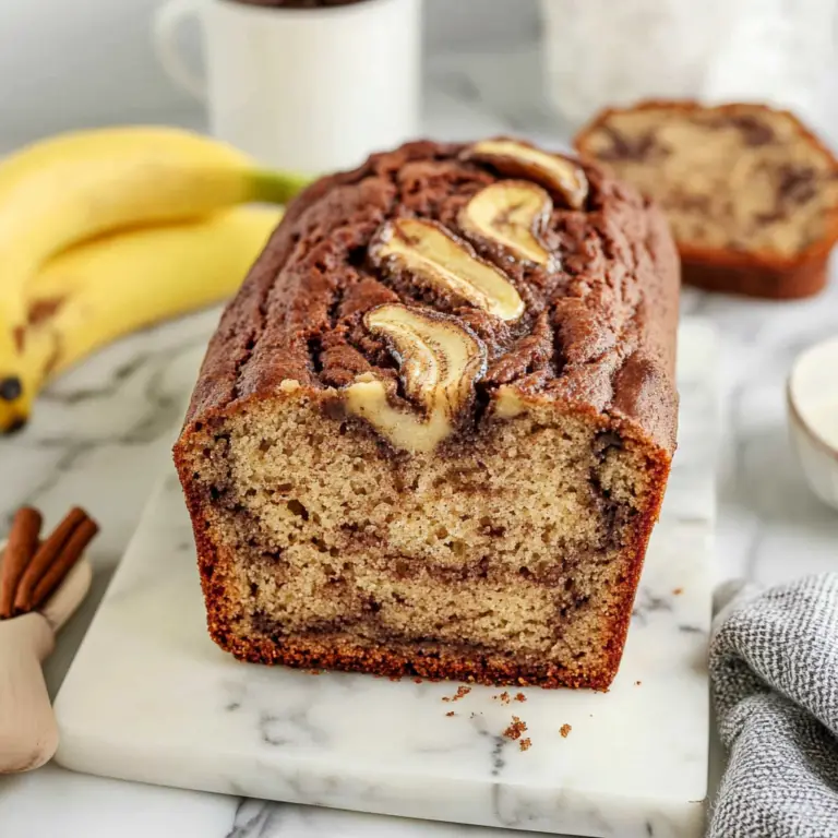 Cinnamon Swirled Banana Bread is an indulgent treat that perfectly balances the natural sweetness of ripe bananas with a delightful cinnamon flavor. This moist and fluffy loaf is ideal for breakfast, a snack, or dessert, making it a versatile addition to any meal. The rich buttery base combined with swirls of cinnamon sugar creates a comforting experience that both kids and adults will love. Simple to prepare with common ingredients, this recipe offers flexibility for customization; you can add nuts, chocolate chips, or dried fruits to elevate the flavors even further. Enjoy a slice warm from the oven or at room temperature—this banana bread is sure to be a family favorite!