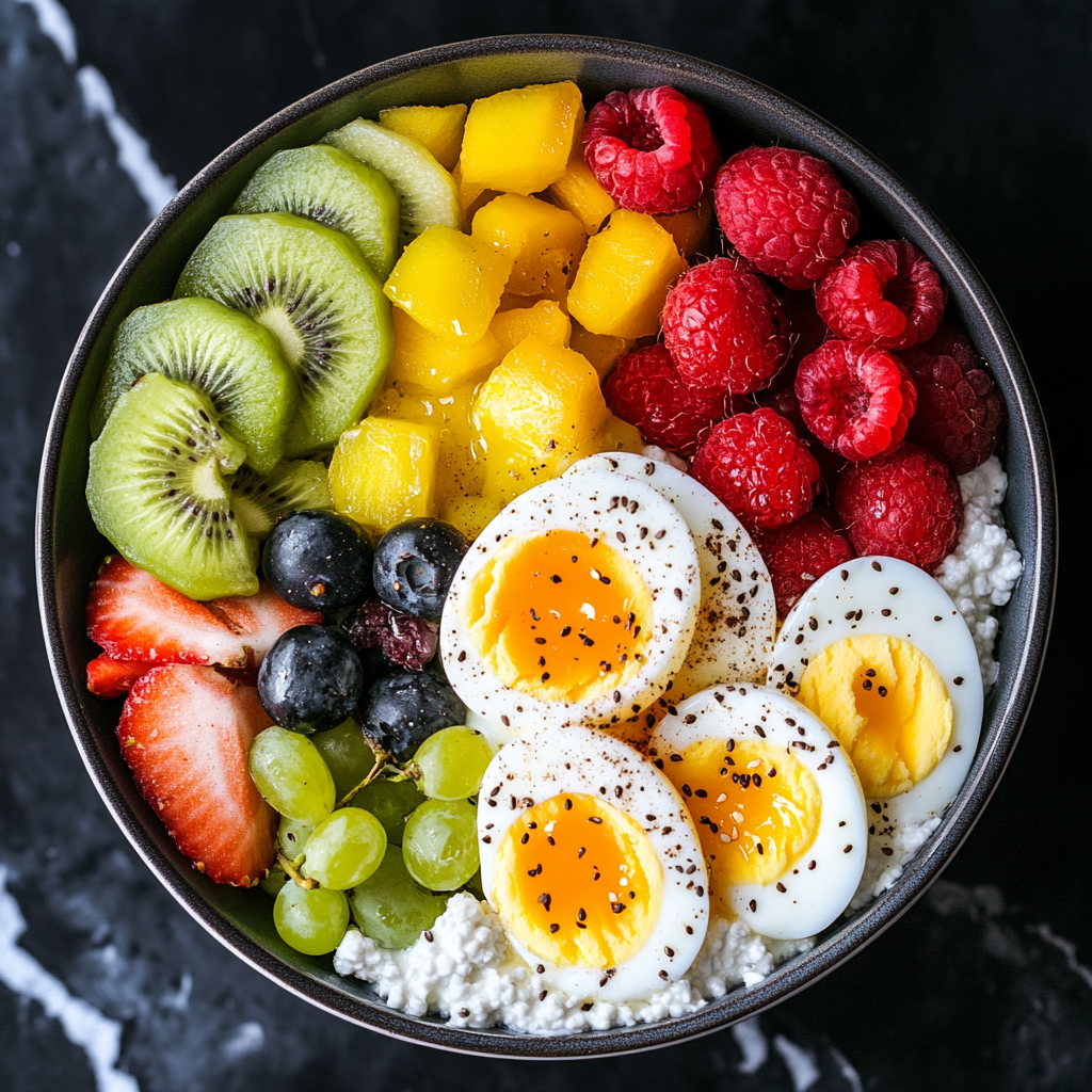 A Colorful Cottage Cheese Breakfast Bowl is a nutritious meal featuring creamy cottage cheese paired with soft-boiled eggs, vibrant fruits, and other healthy toppings.