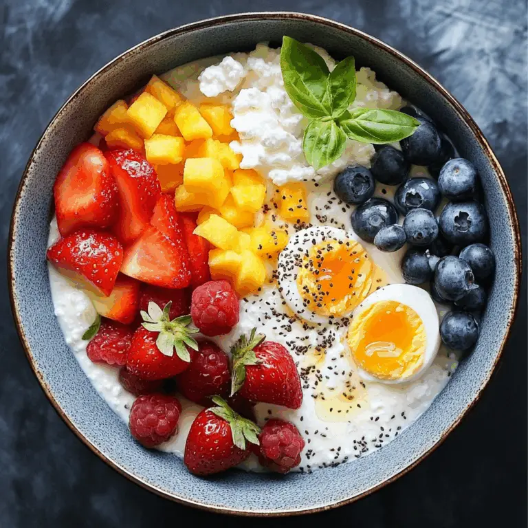 Colorful Cottage Cheese Breakfast Bowl with Soft-Boiled Eggs & Fruit is a deliciously vibrant way to start your day. This bowl combines creamy cottage cheese, perfectly soft-boiled eggs, and a variety of fresh fruits for a balanced breakfast that is both satisfying and nutritious. Suitable for busy mornings or leisurely brunches, it’s a dish that appeals to everyone looking for a wholesome meal.