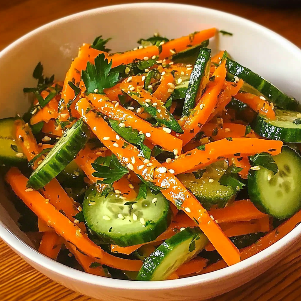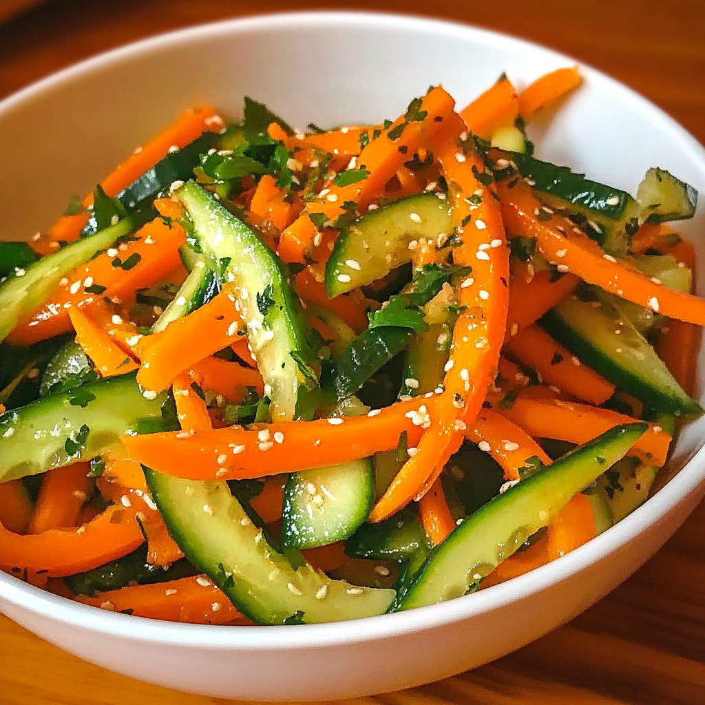 Cucumber Carrot Salad is a refreshing dish made from fresh cucumbers and carrots, dressed with a simple mixture of olive oil, lemon juice, and spices.