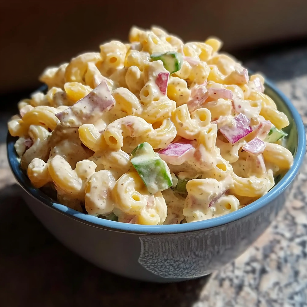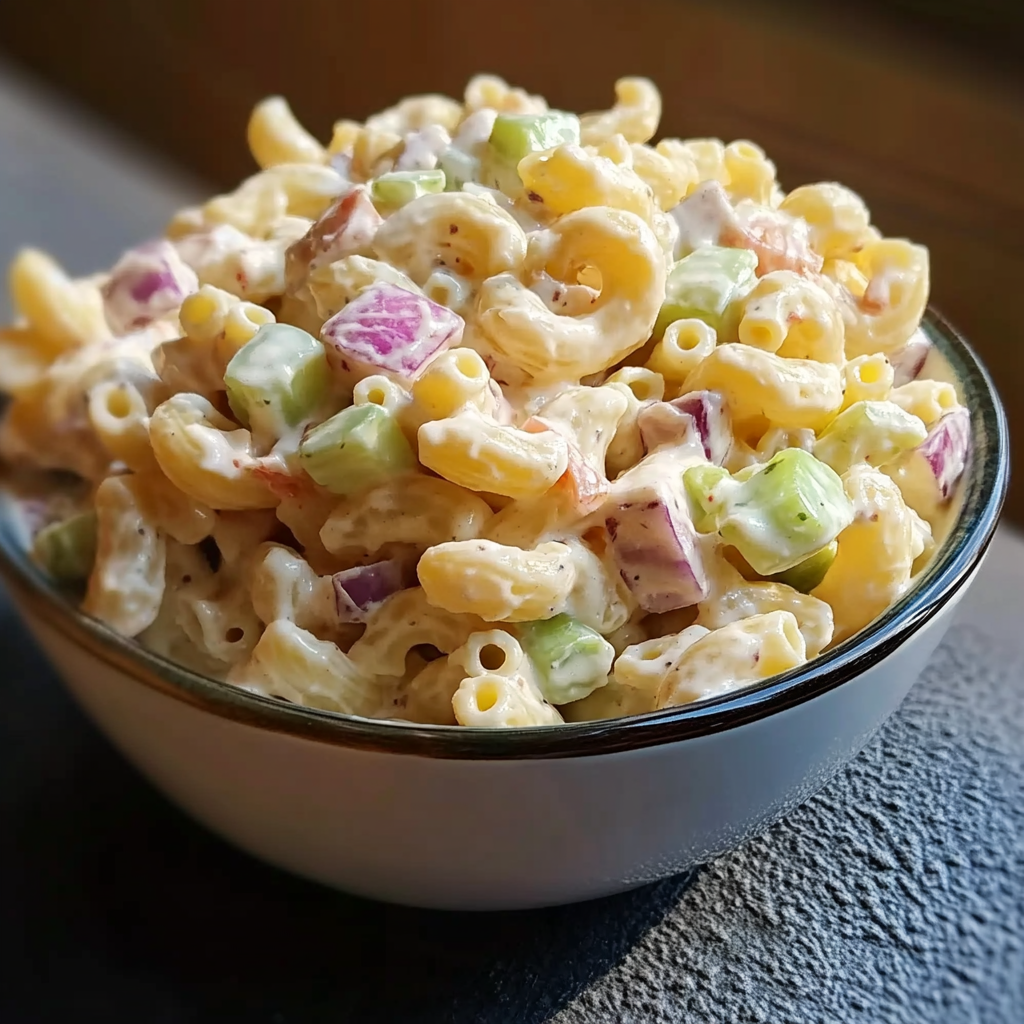 A creamy and tangy macaroni salad filled with crunch from celery and onion, perfect for picnics and barbecues.