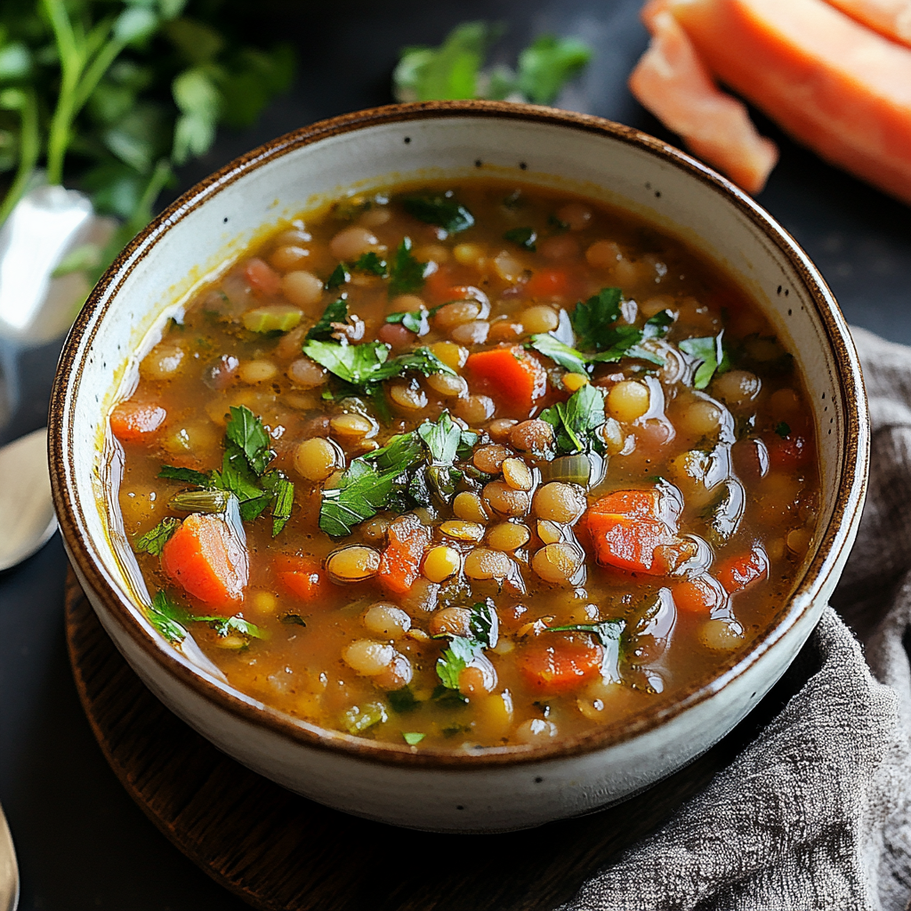 Mediterranean Lentil Soup features wholesome ingredients that contribute to its hearty flavor.