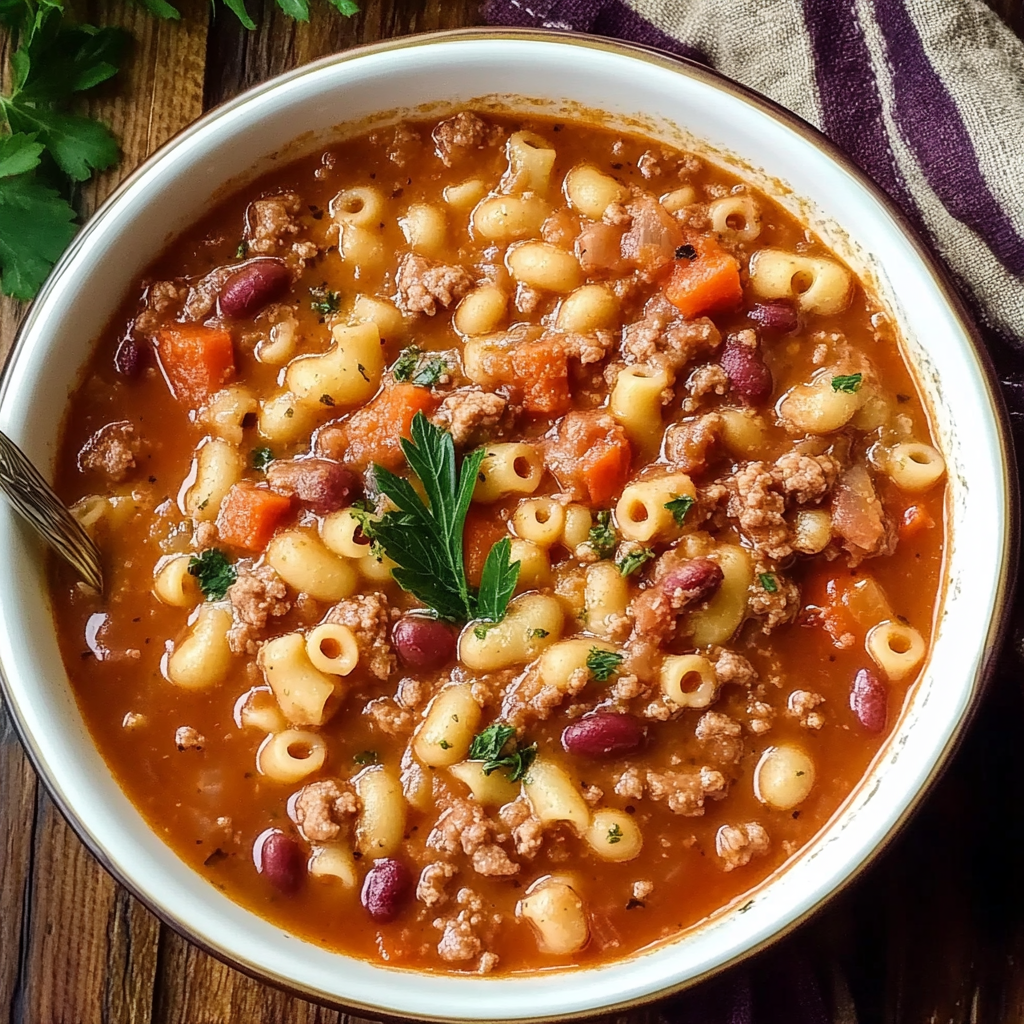 Olive Garden Pasta E Fagioli is a hearty Italian-American soup made with ground beef, beans, pasta, and vegetables simmered in a flavorful broth.