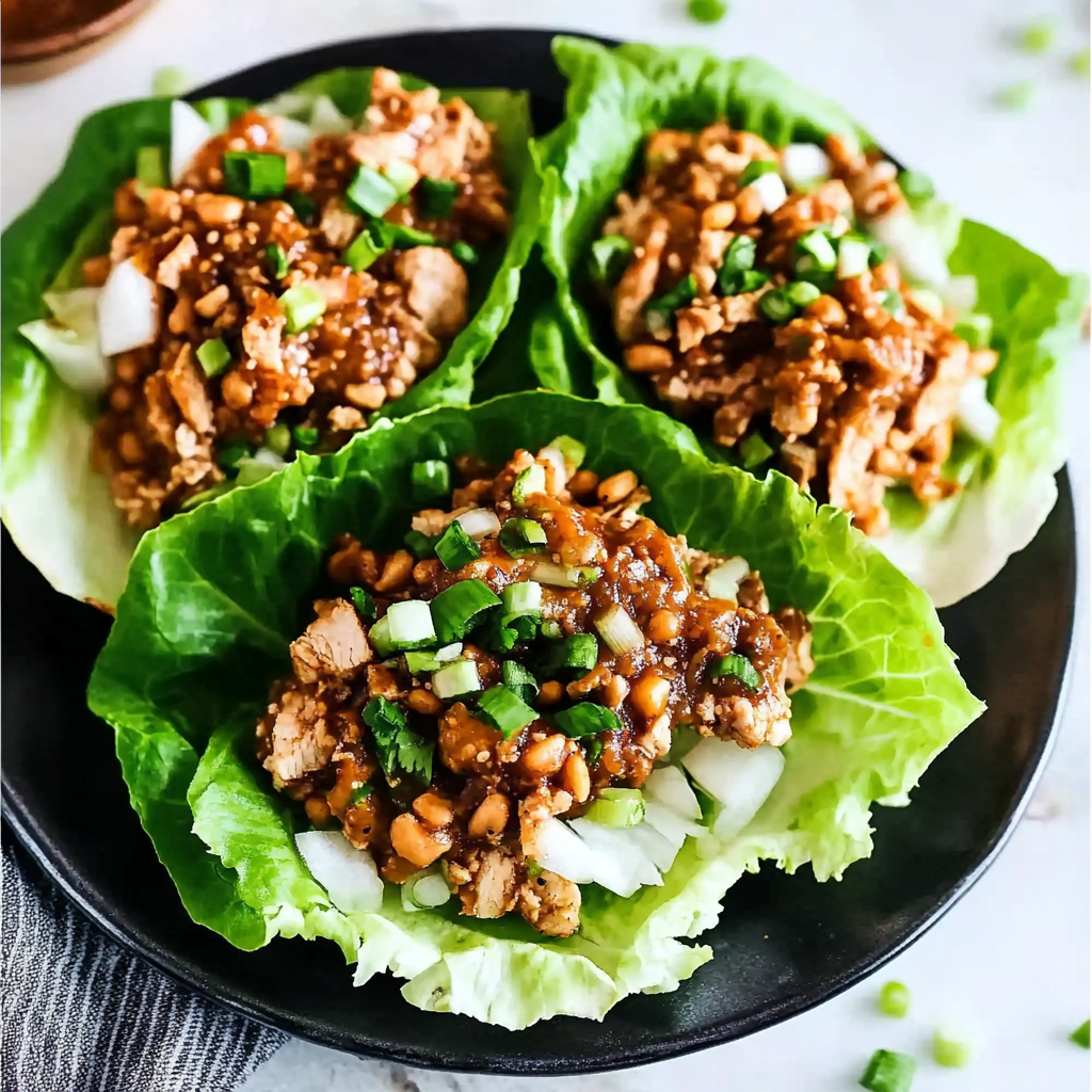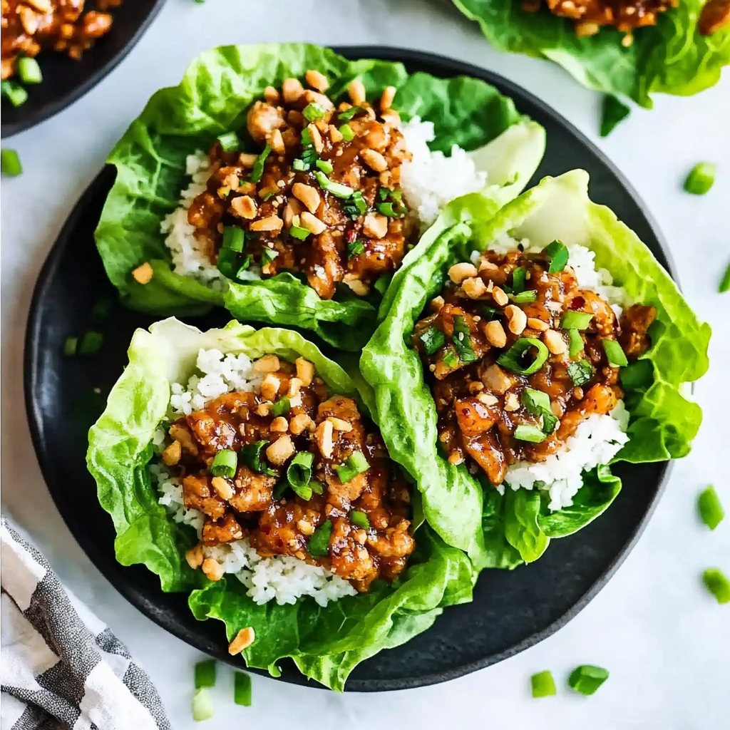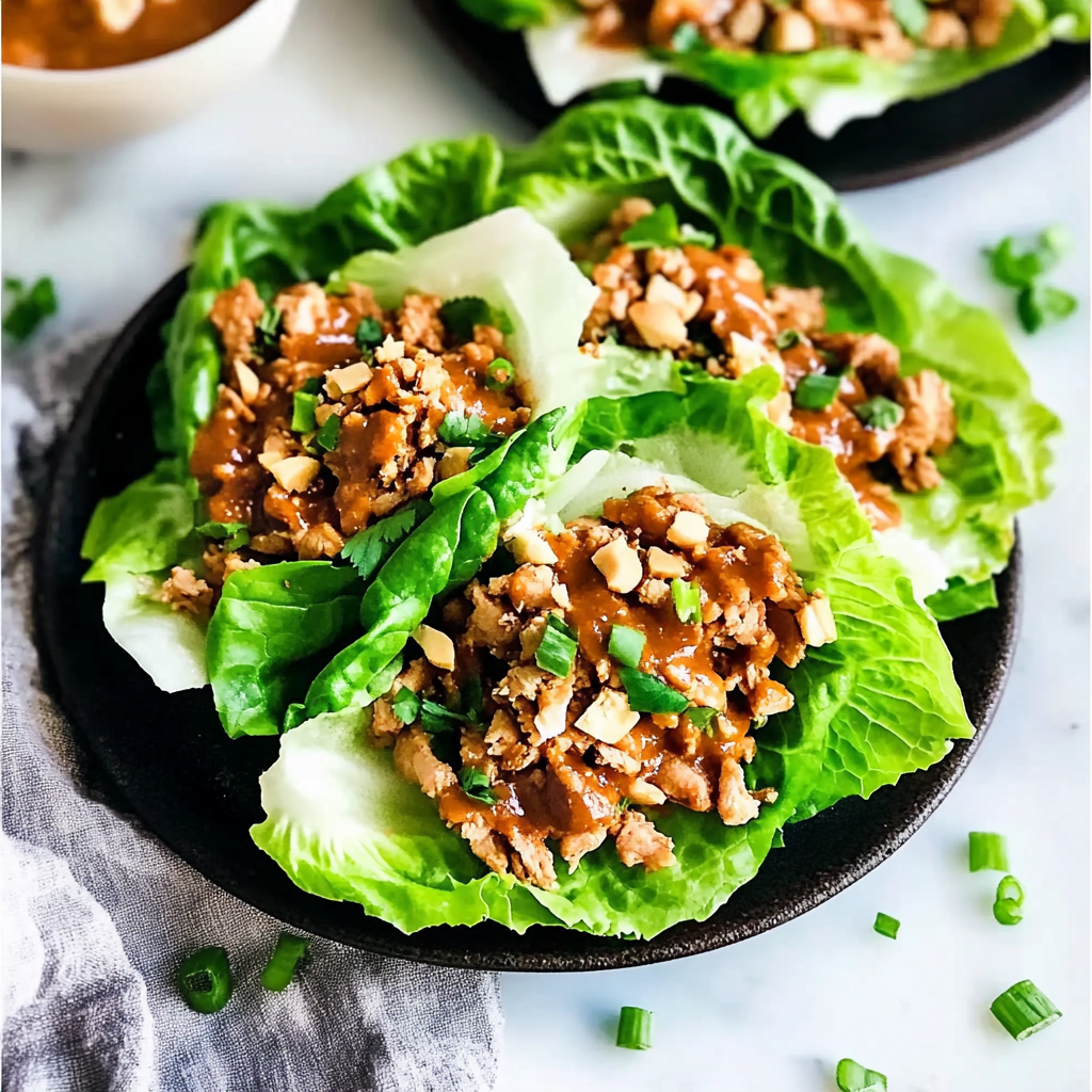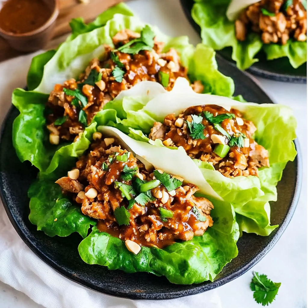 Peanut Chicken Lettuce Wraps with Ginger Garlic Sauce are savory wraps filled with marinated chicken, peanuts, and vegetables, served fresh in crisp lettuce leaves.
