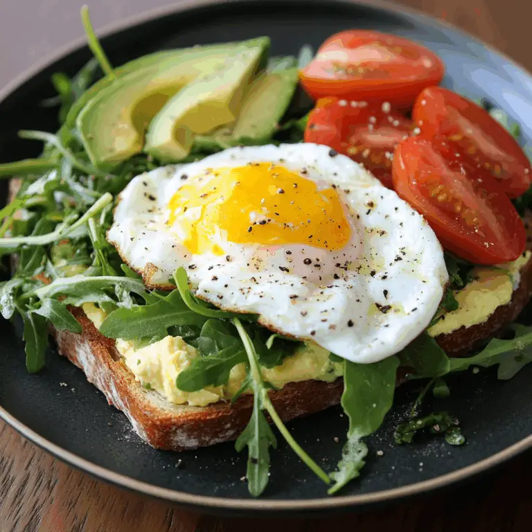 Elevate your dining experience with this vibrant Poached Egg & Arugula Salad with Avocado, Tomato & Cream Cheese Toast. This refreshing dish combines the peppery flavor of arugula, the creaminess of ripe avocado, and the sweetness of juicy tomatoes, all topped with perfectly poached eggs. Served alongside herbed cream cheese spread on toasted rustic bread, it’s a delightful option for breakfast or a light lunch that is both quick to prepare and visually stunning. Packed with nutrients and bursting with flavor, this salad is sure to impress at any meal.